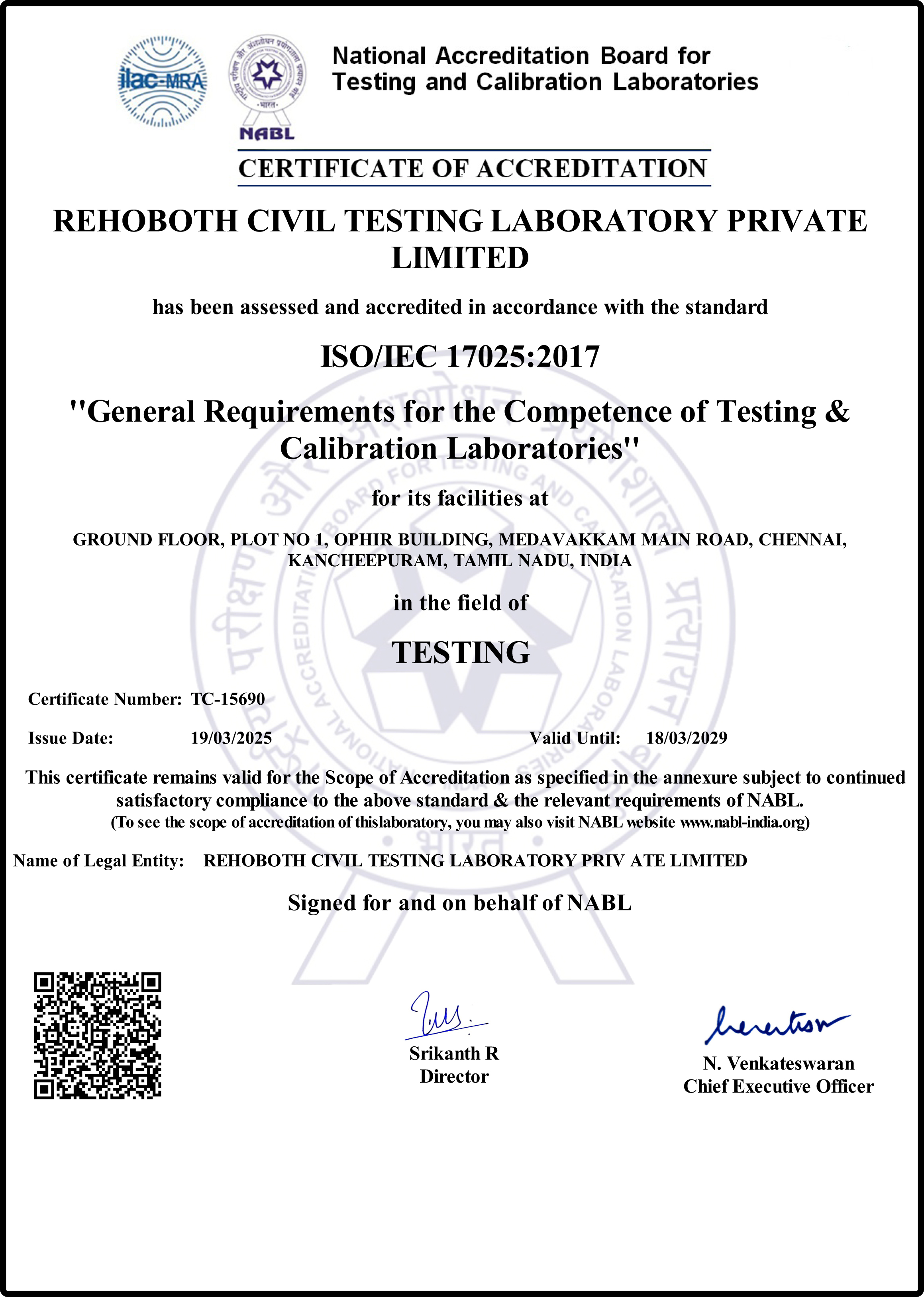 This is to kindly inform you that Rehoboth Civil Testing Laboratory is accredited by National Accreditation Board for Testing and Calibration Laboratories (NABL (ISO /IEC / 17025 – 2017).